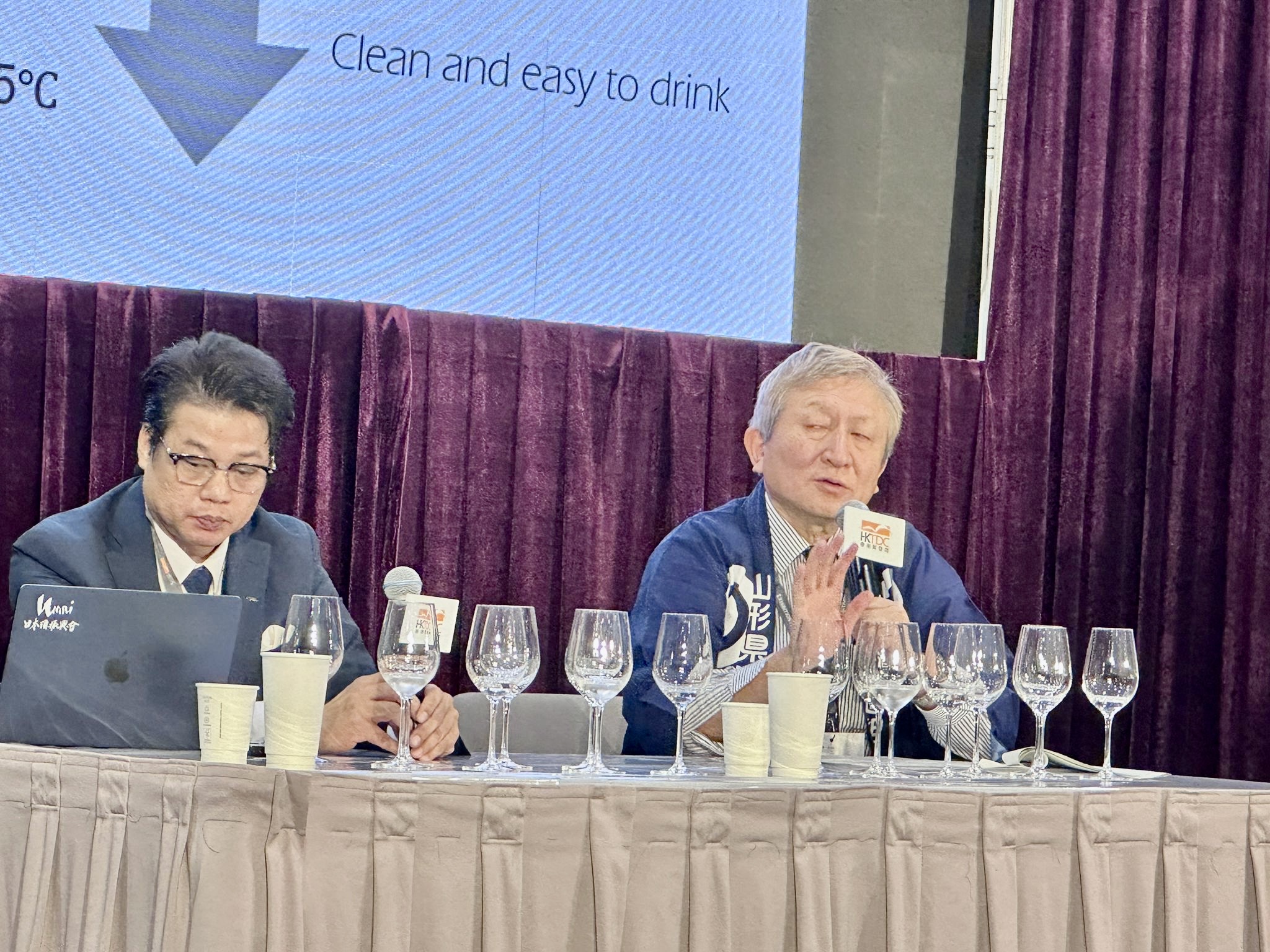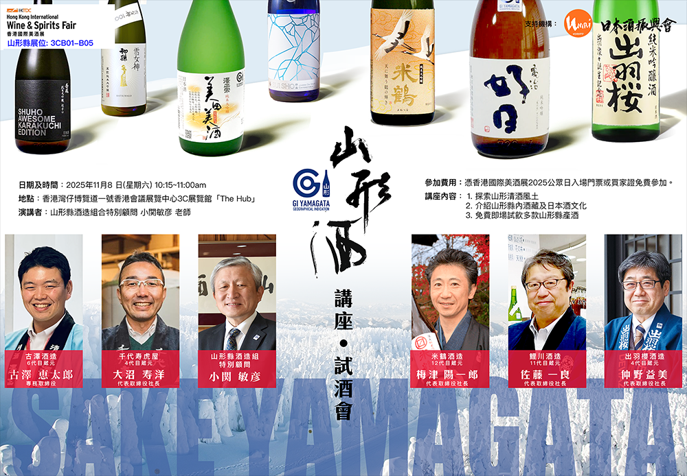 由山形縣酒造組合特別顧問 小関敏彦 老師 (右)與日文酒振興會會長、UMAI Magazine 社長 Jeffrey Lau (左) 主持的《Yamagata Sake Terroir》試酒會一共試飲了8款各具特色的山形美酒,吸引了眾多日本清酒愛好者到場參加。