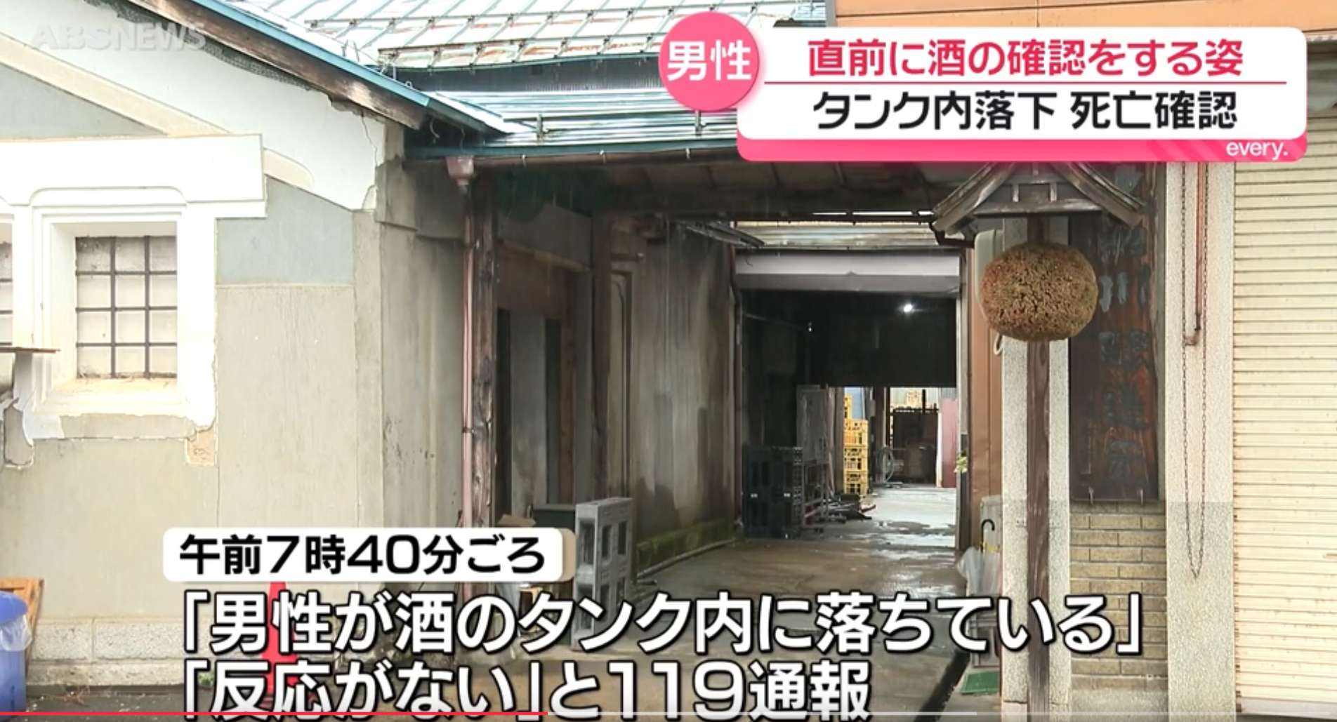日テレ𝗡𝗘𝗪𝗦 𝗡𝗡𝗡〈酒造会社の酒タンク内で𝟰𝟬代男性を発見 病院で死亡確認〉(𝟮𝟬𝟮𝟲年𝟰月𝟮日)